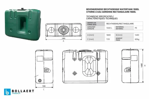 Deze bovengrondse regenwatertank van 1500 liter is vervaardigd uit hoogwaardig polyethyleen. Ze zijn duurzaam, slijtvast en UV-bestendig, waardoor ze zowel binnen als buiten geplaatst kunnen worden.