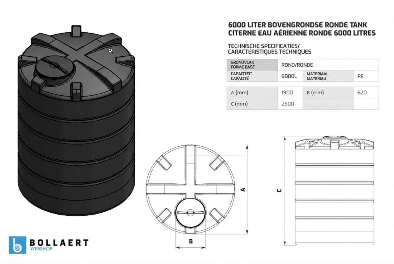Deze bovengrondse watertank van 6.000 liter met pomp is vervaardigd uit duurzaam polyethyleen (PE). Deze ronde watertanks zijn bijvoorbeeld een ideale oplossing, wanneer de plaatsing van een ondergrondse tank niet mogelijk is.