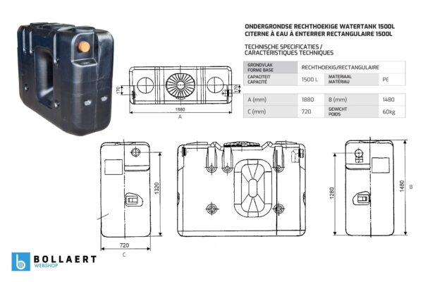 De volledige plaatsingsvoorschriften voor deze ondergrondse rechthoekige regenwatertank PANAMA (met alle details over afstanden, hoeveelheden, …)