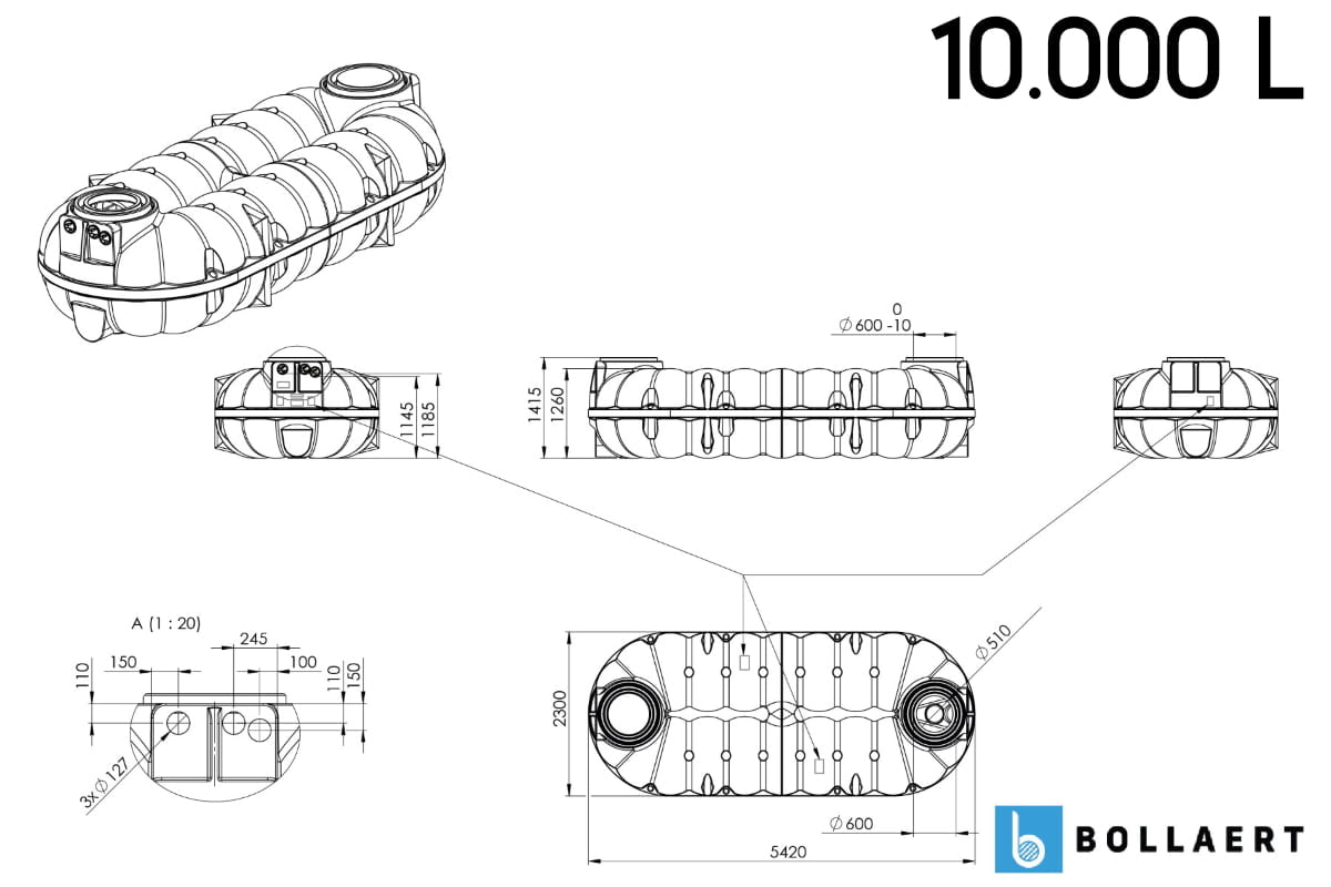 De kunststoffen (PE) septic tank van 10.000 liter heeft een speciale vorm die ervoor zorgt dat deze tank enorm stevig en sterk is. Deze tank kan manueel geplaatst worden zonder kraan. De septic tank kan verhoogd worden met een extra verlengstuk (zie ‘Andere suggesties…’). Op de in- en overloop kan een PVC-buis van 125 mm aangesloten worden.