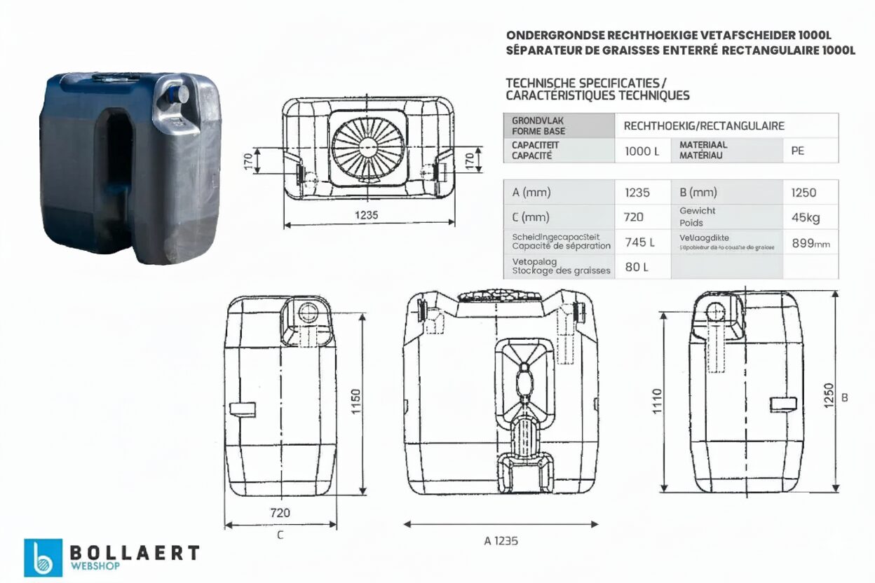 Deze compacte vetafscheider draag je makkelijk door eender welke standaard deur. Zeer eenvoudige installatie. Vaak wordt deze vetafscheider in de kelder geplaatst.
